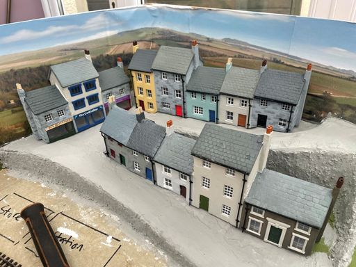 Having created a sloping village street winding up from the harbour, the first row of cottages was cut from mount board and glued with UHU. These were also liberally coated with Polyfilla, sanded and scribed, then painted a variety of colours in Humbol enamel. The next 2 terraces were cut from mdf, a little tricky cutting window apertures, but much more sturdy. Windows are mostly by Wills, with ratio gutters and drainpipes.